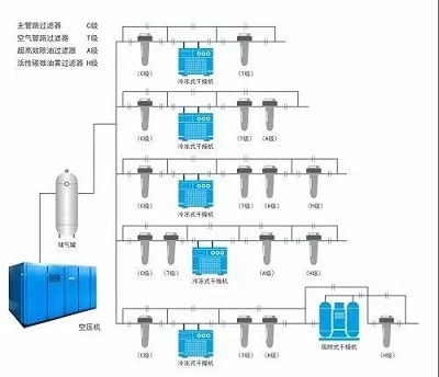 絕大多數(shù)空壓機機組內(nèi)都配有壓縮空氣冷卻器,空壓機運行時經(jīng)油氣分離器分離后的熱壓縮空氣進入壓縮空氣冷卻器進行冷卻,壓縮空氣冷卻過程中,其中的水汽趨于過飽和狀態(tài)后析出冷凝水(冷凝水的多少與排氣壓力、環(huán)境濕度成正比),從空壓機供氣口排出的為微油壓縮空氣(含油量≤3PPM)和冷凝水。最常見的空壓機后處理配置為:空壓機+儲氣罐+C級過濾器+冷干機+ T級過濾器+ A級過濾器,其余后處理配置類型見圖1。